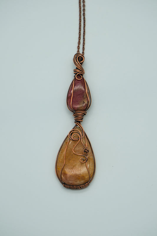 Rhodonite and Hematite Quartz Copper Wire Wrapped Double Pendant