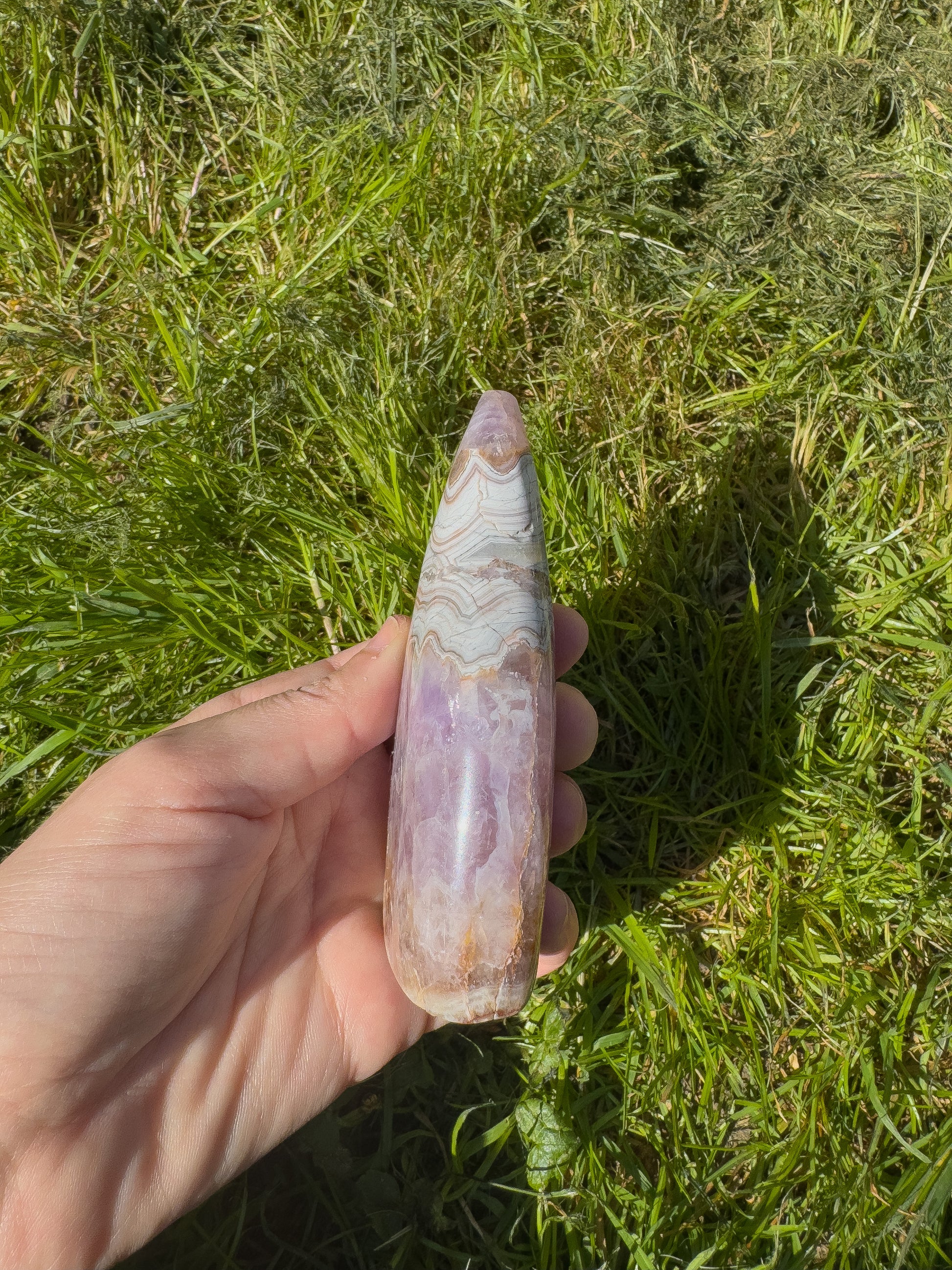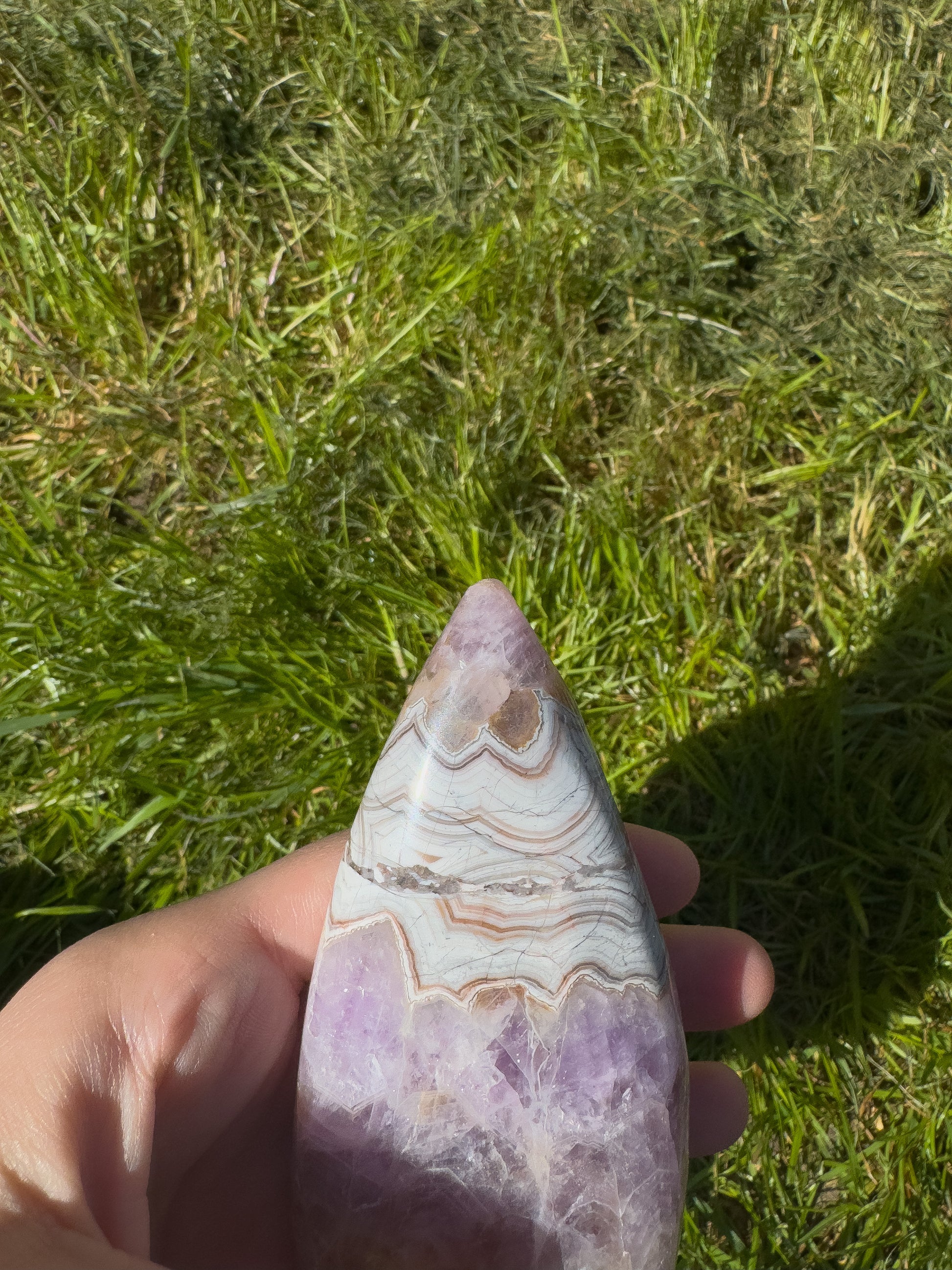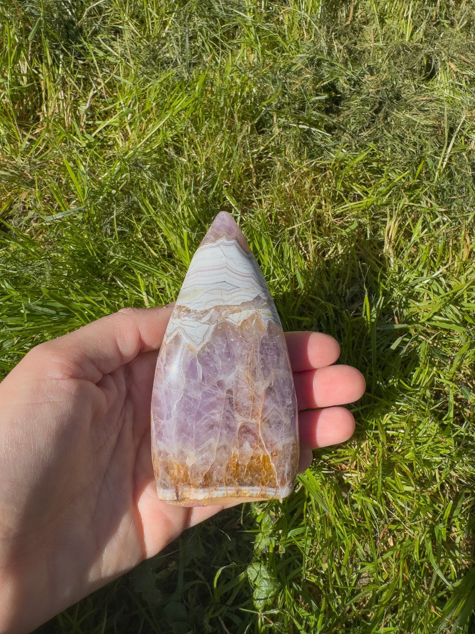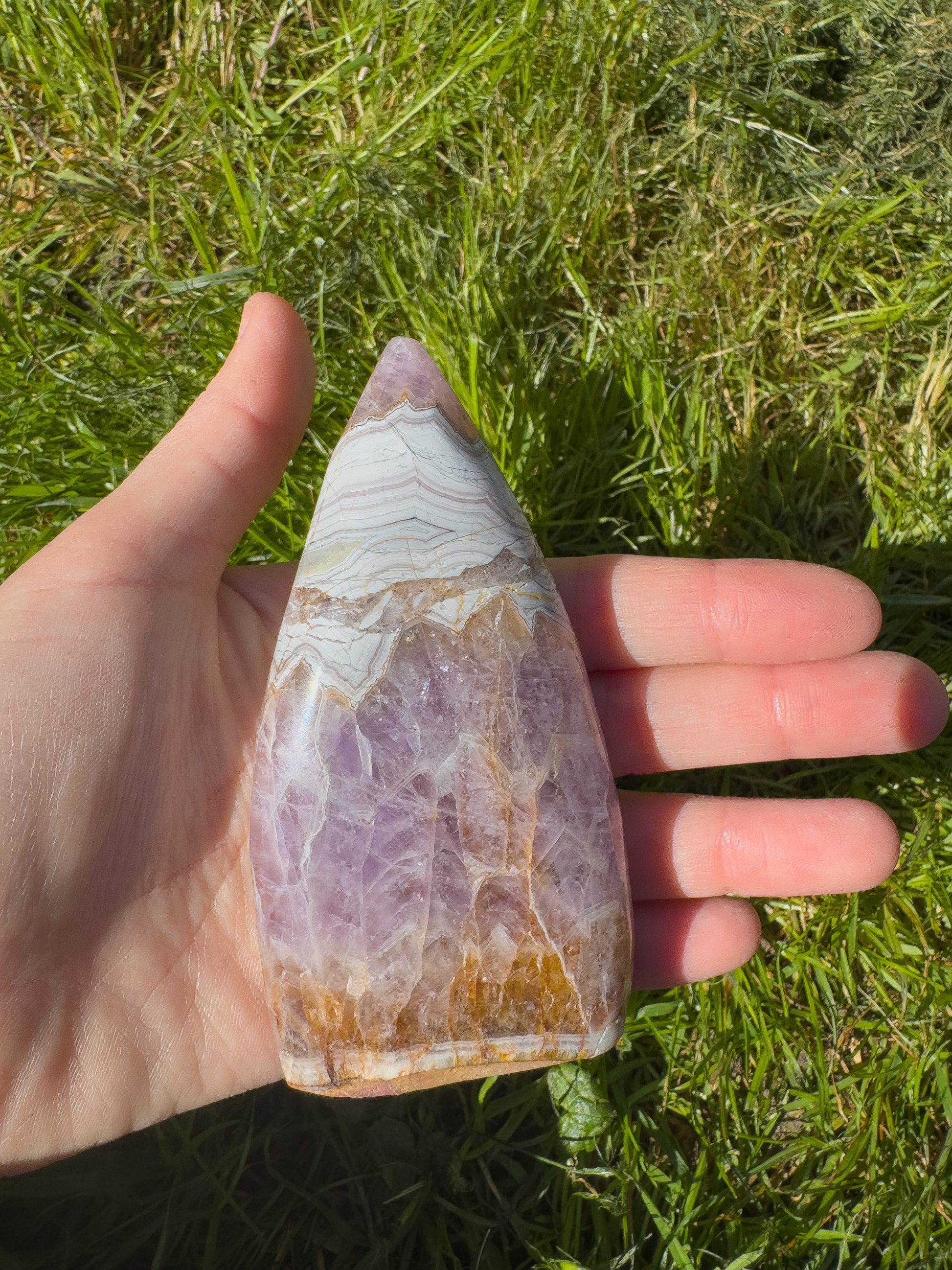 This stunning freeform has a combination of calming amethyst with vibrant crazy lace agate. Amethyst is known for its protective, cleansing, and soothing properties, often used to support restful sleep and intuitive growth. Crazy lace agate is said to bring joy, balance, and grounding energy – often referred to as the “laughter stone.”