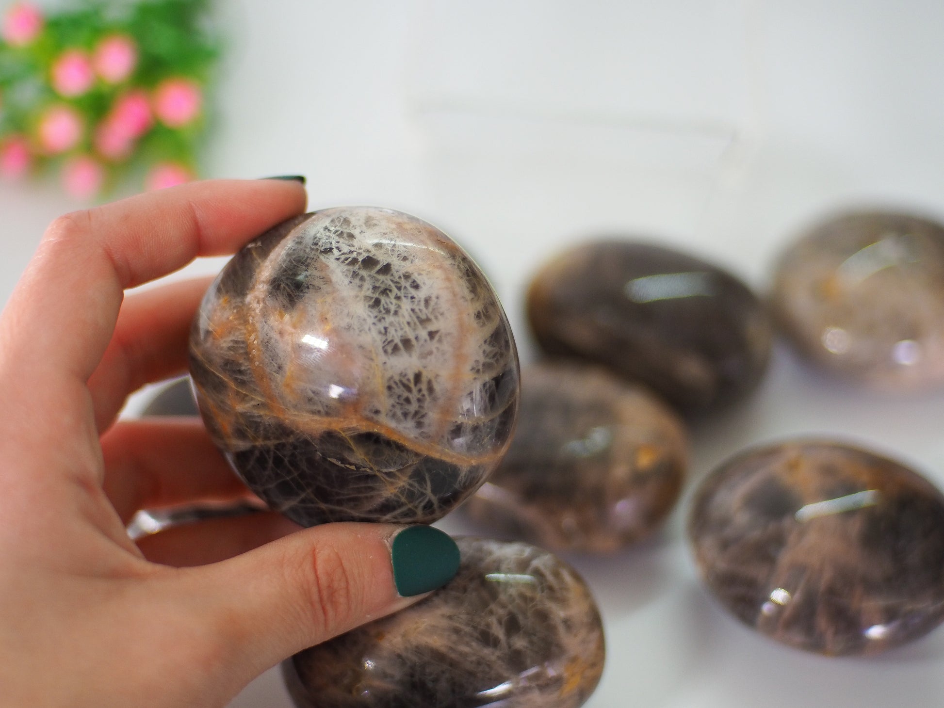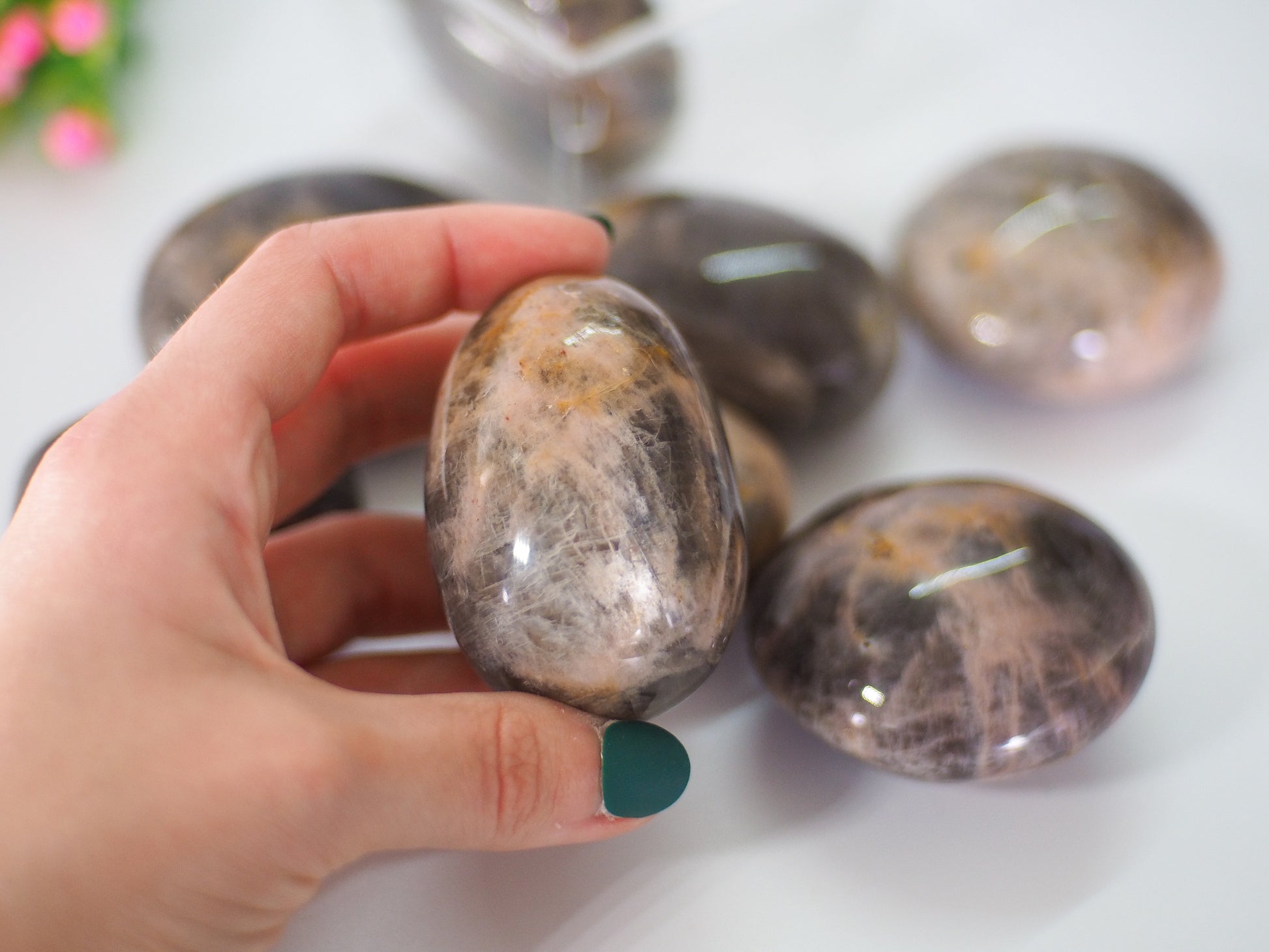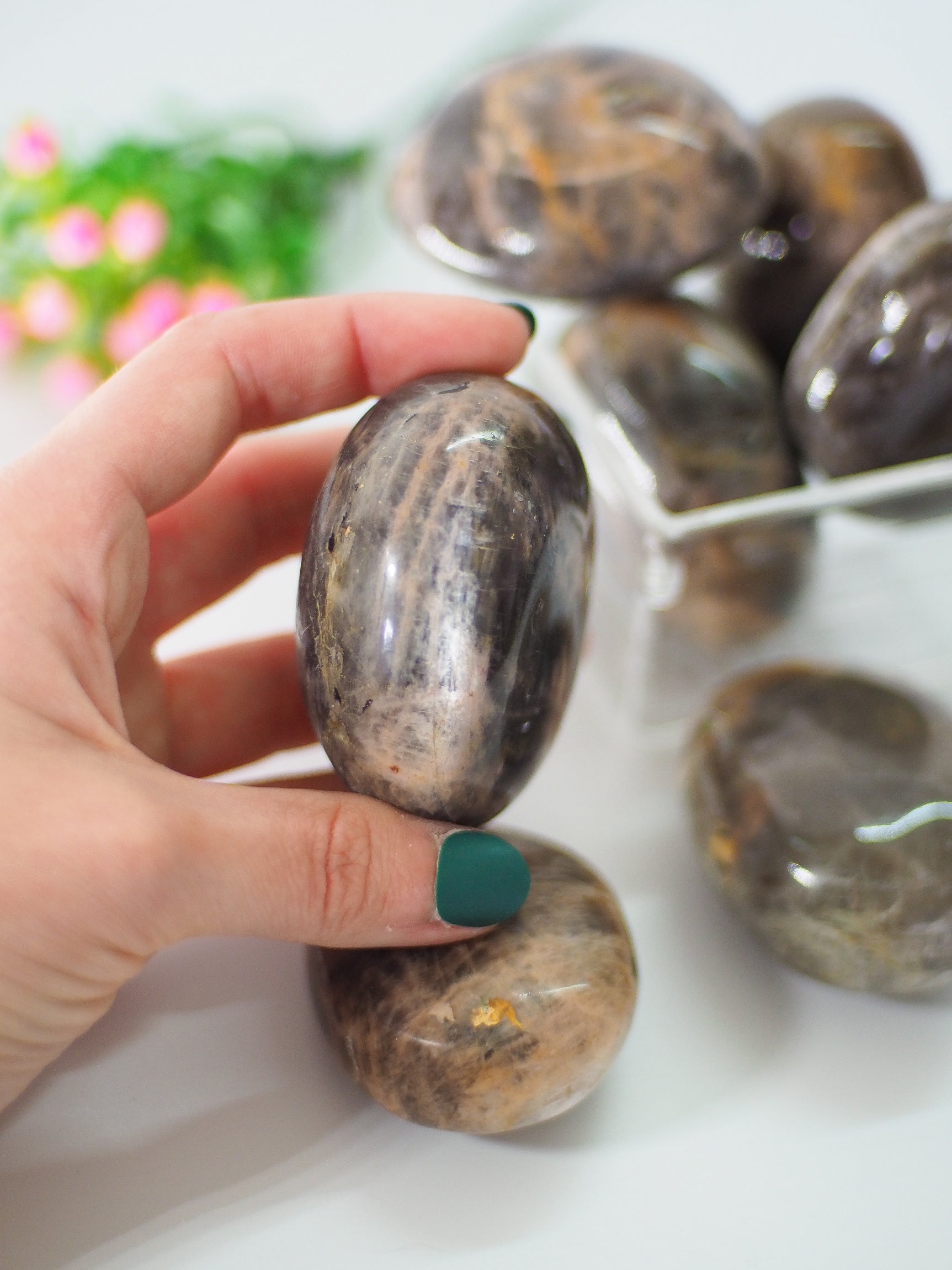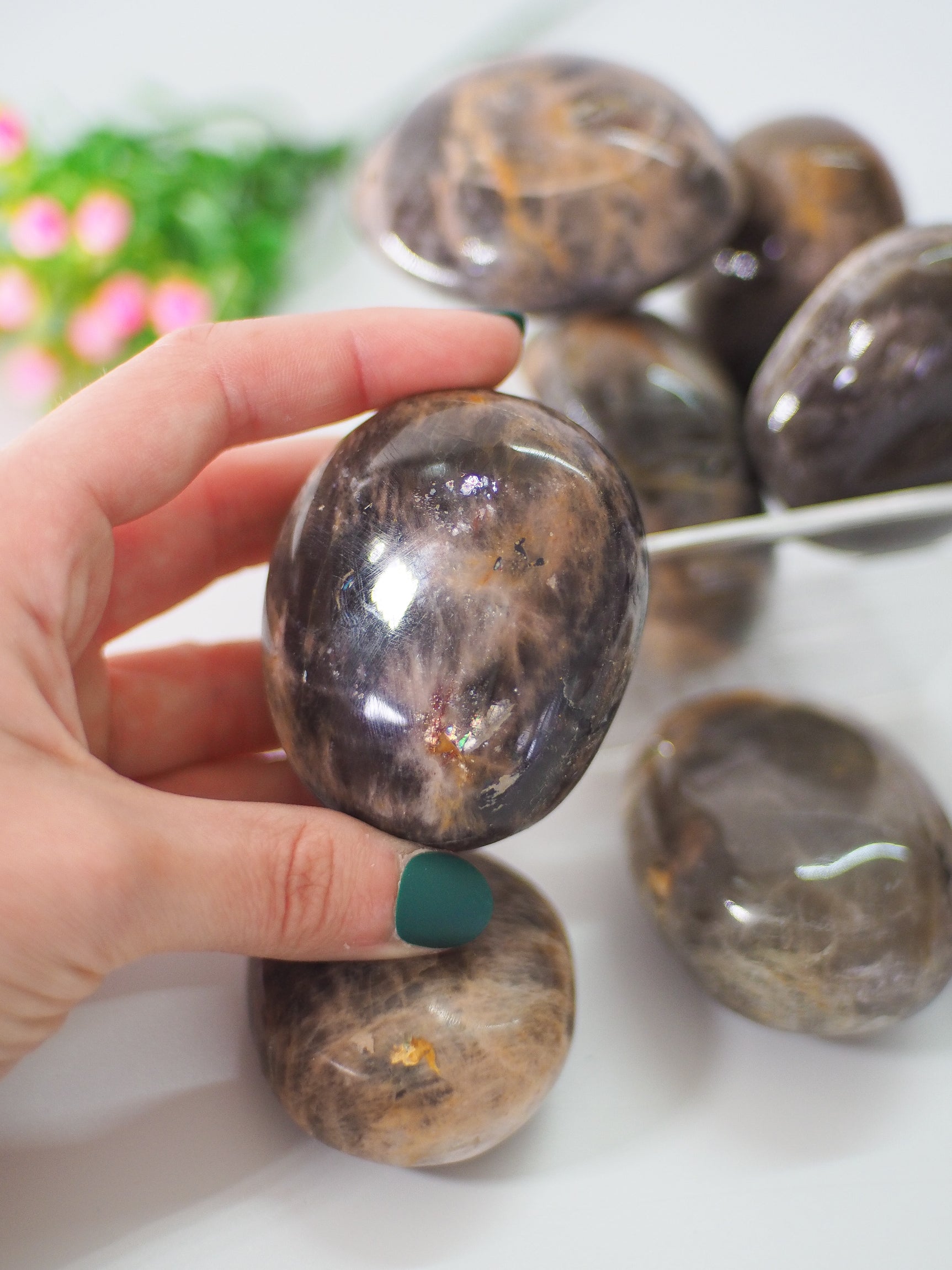 Beautiful, shimmery black moonstone palm stones - price is for one intuitively picked!