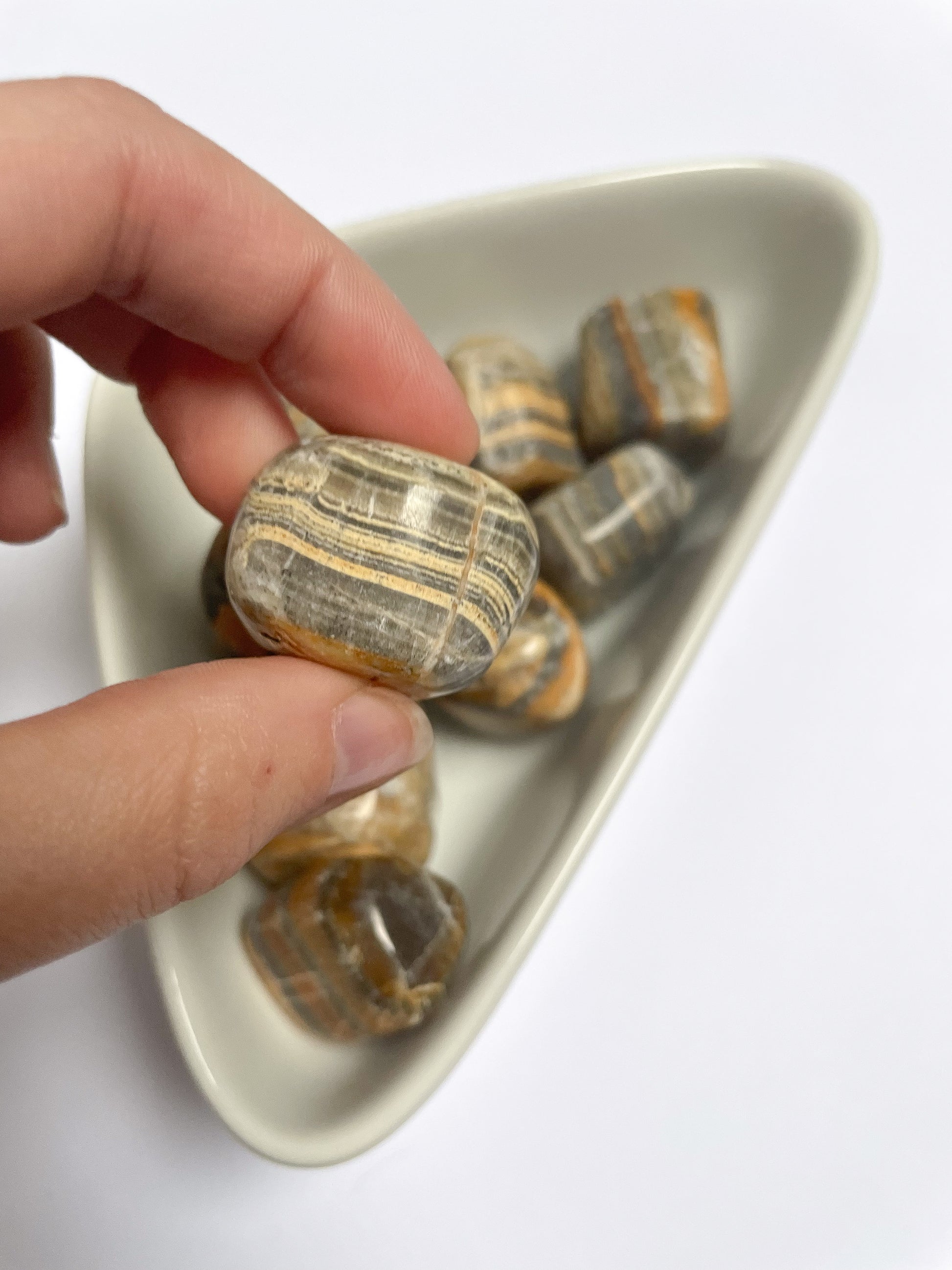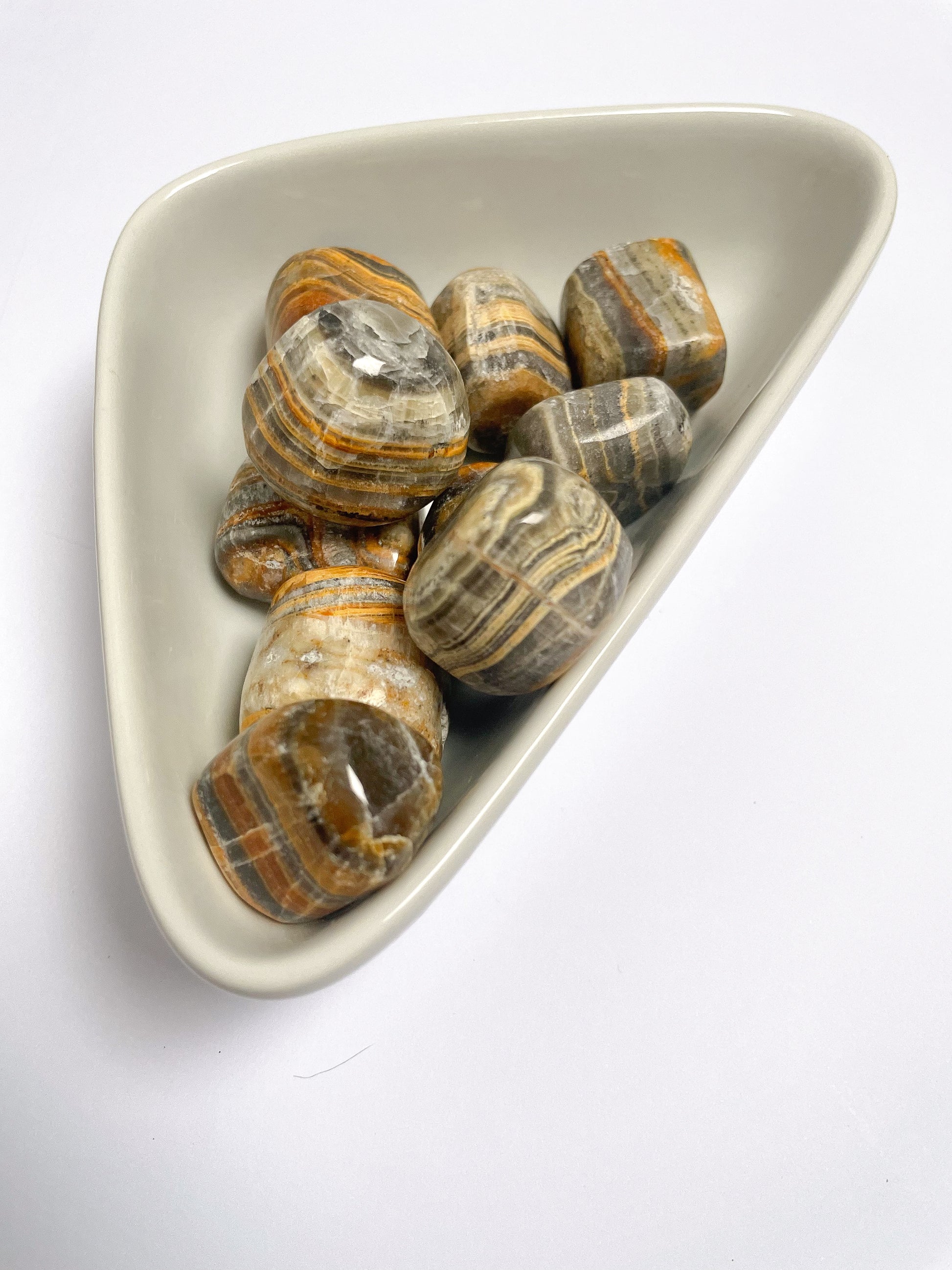 Striking and vibrant bumblebee jasper tumblestones from Indonesia, each with bold natural patterns.
