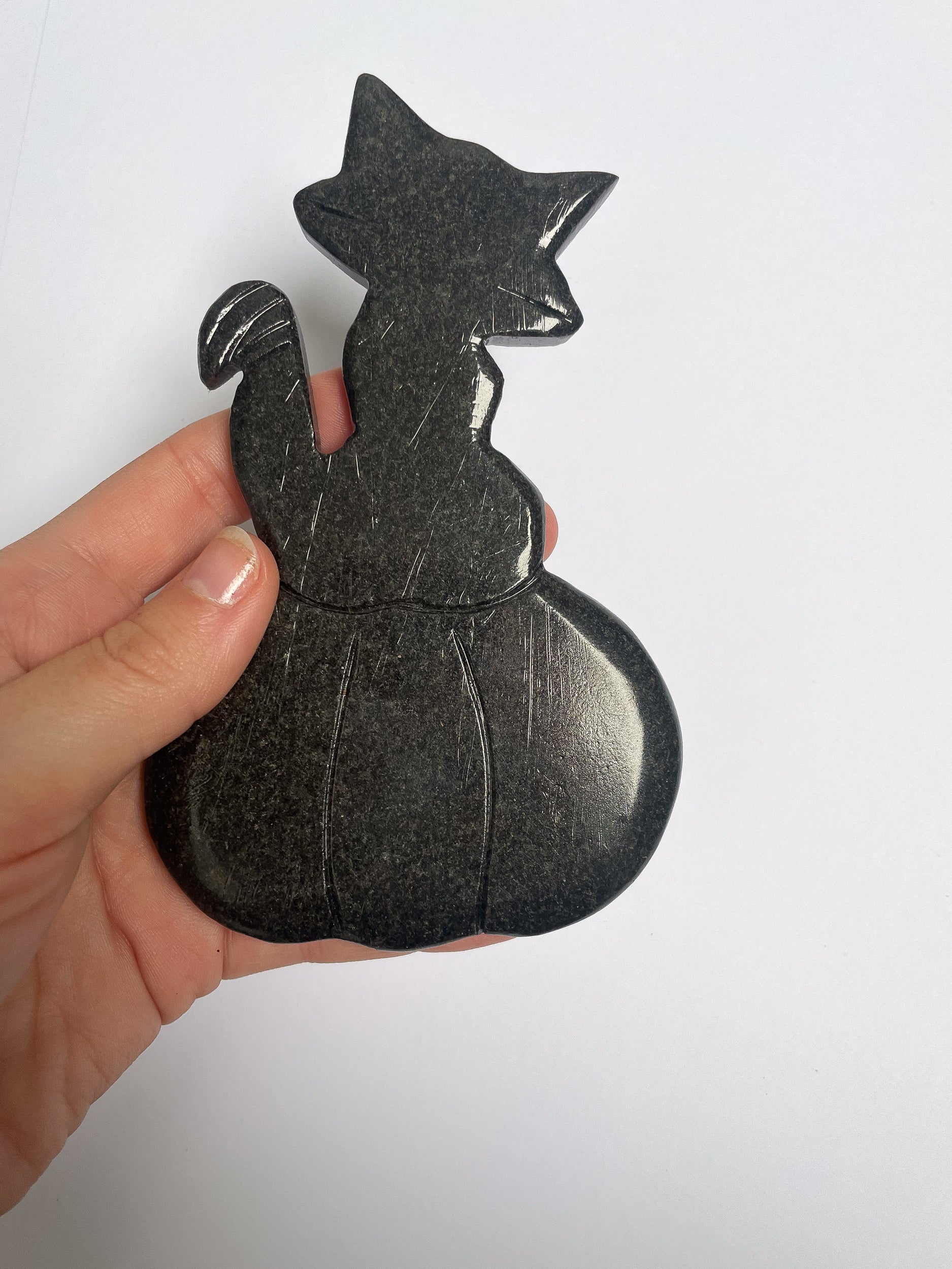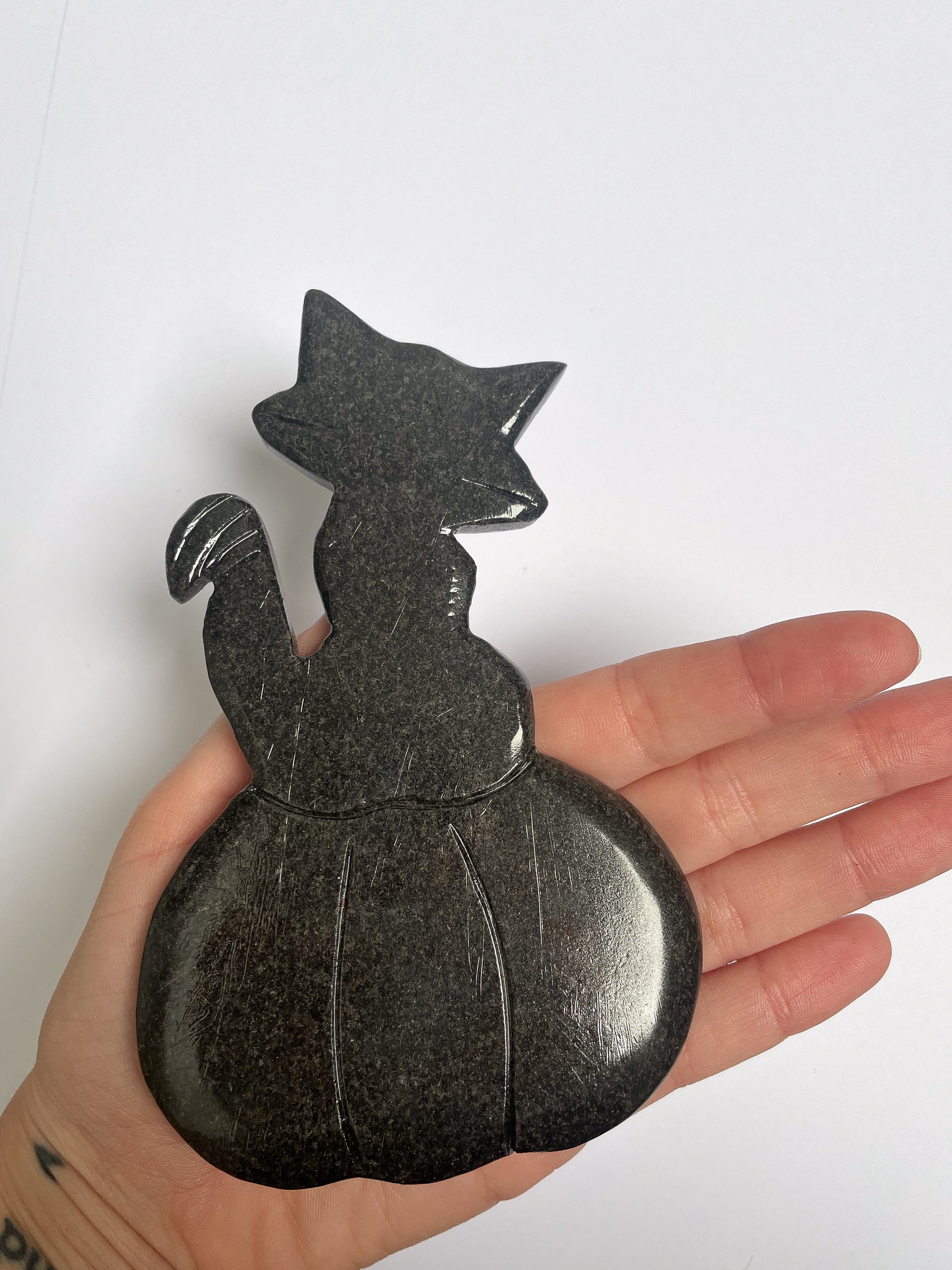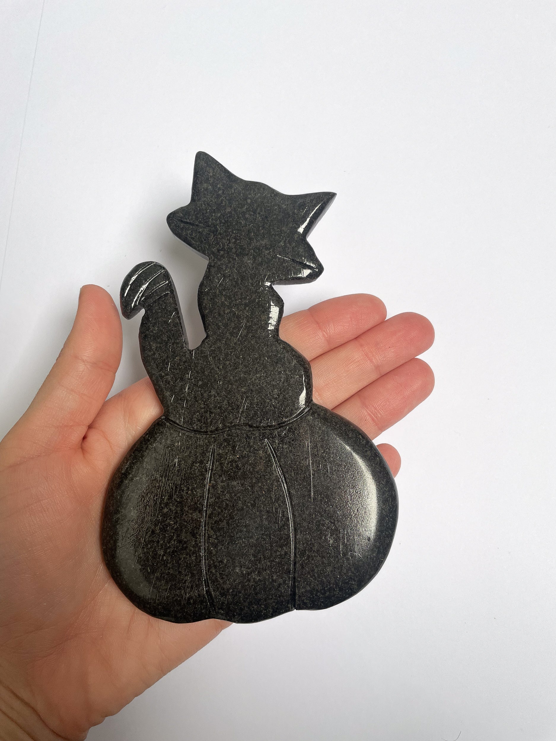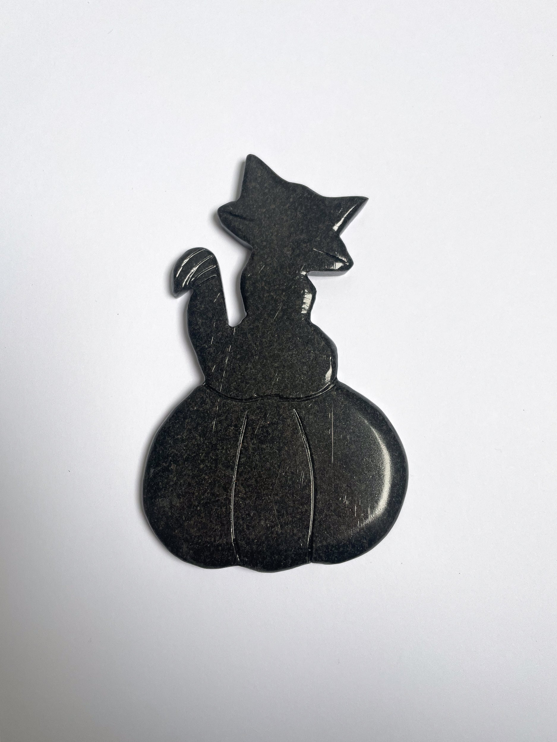 This flat crystal carving of a cat on a pumpkin is crafted from black dolomite, bringing both mystical energy and whimsical charm to your space. Known for its grounding and calming properties, black dolomite helps to promote emotional healing while adding a unique, spooky touch to your decor.