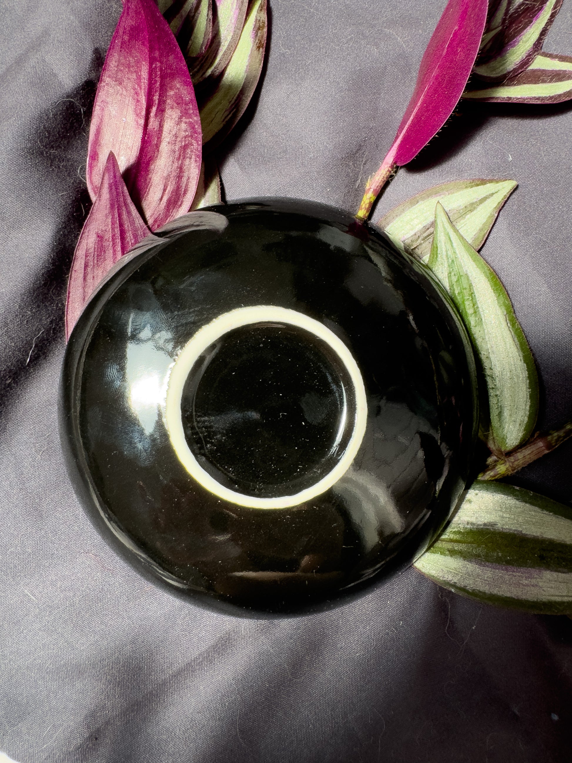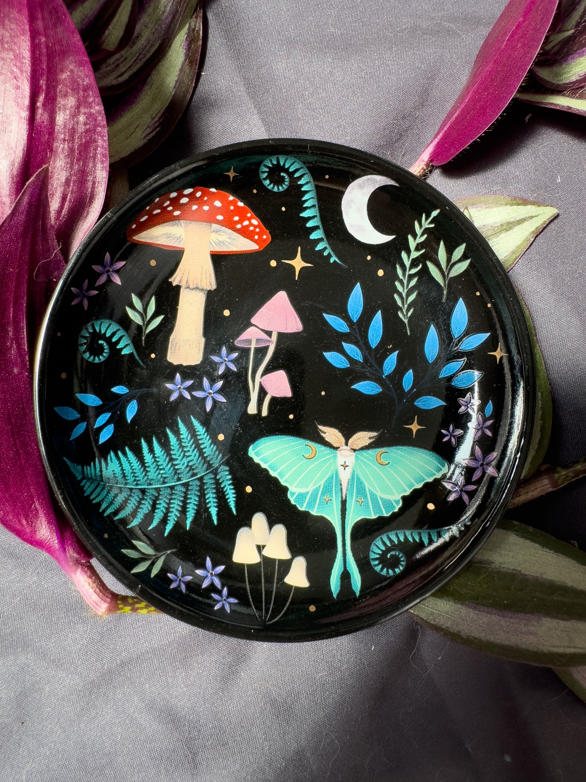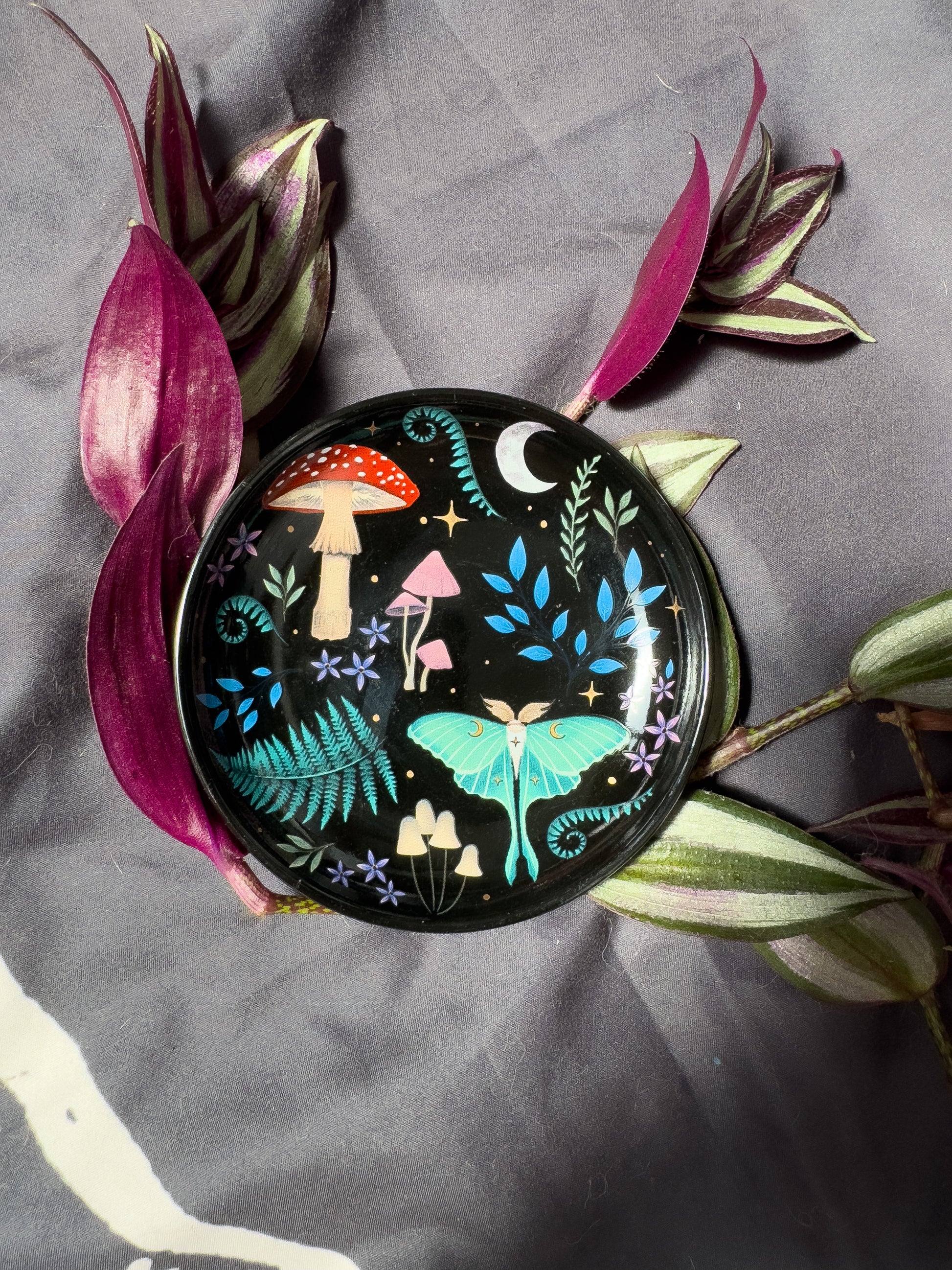 Keep your treasures safe in this black ceramic jewellery dish, featuring a mystical forest design with mushrooms, leaves, and a moth. A magical touch for any bedside or vanity.