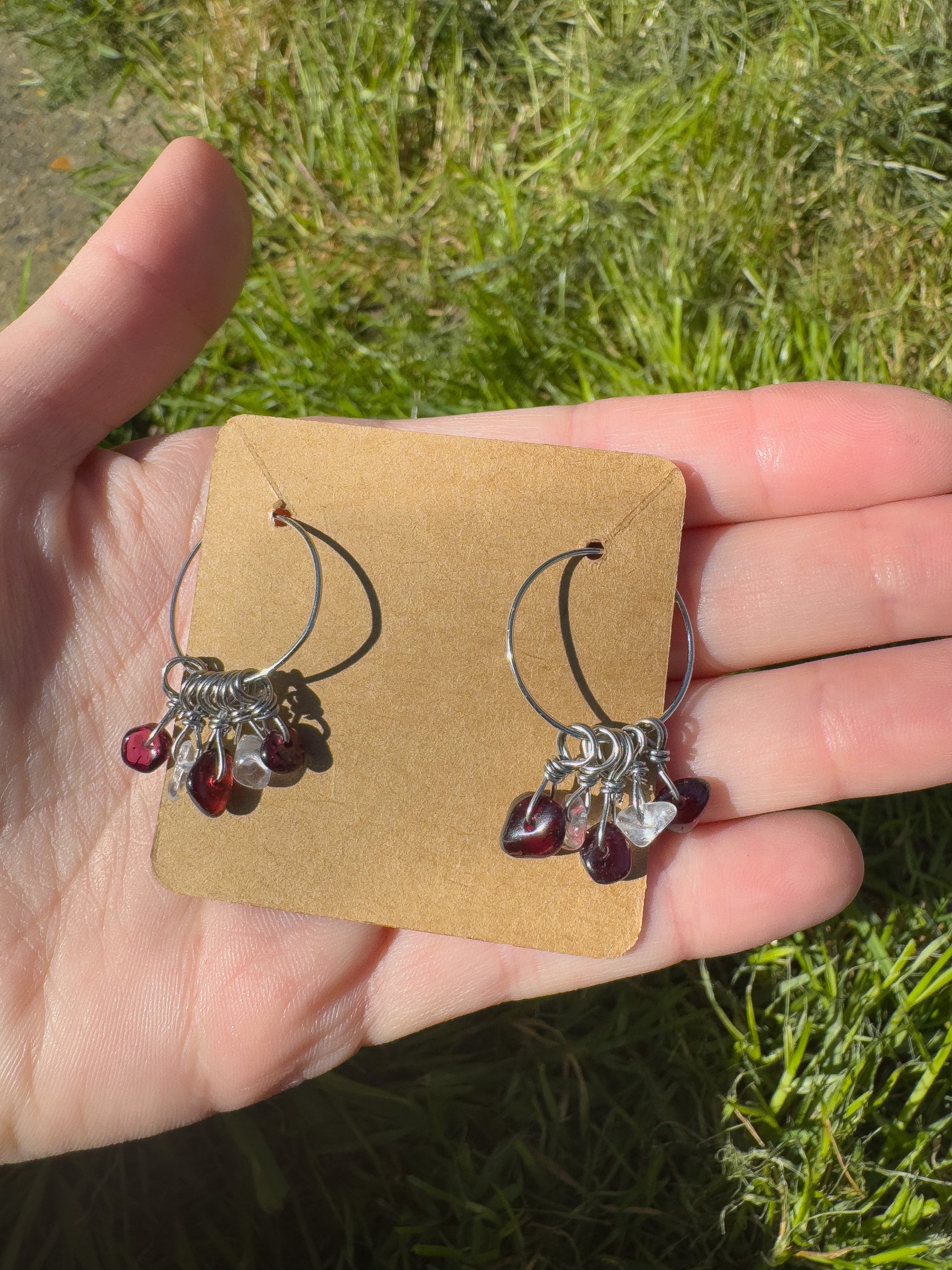 These handmade hoop earrings feature a mix of natural garnet and clear quartz chips, set on stainless steel hoops. The grounding energy of garnet pairs beautifully with the clarity-enhancing properties of clear quartz - making these a powerful and stylish combination.