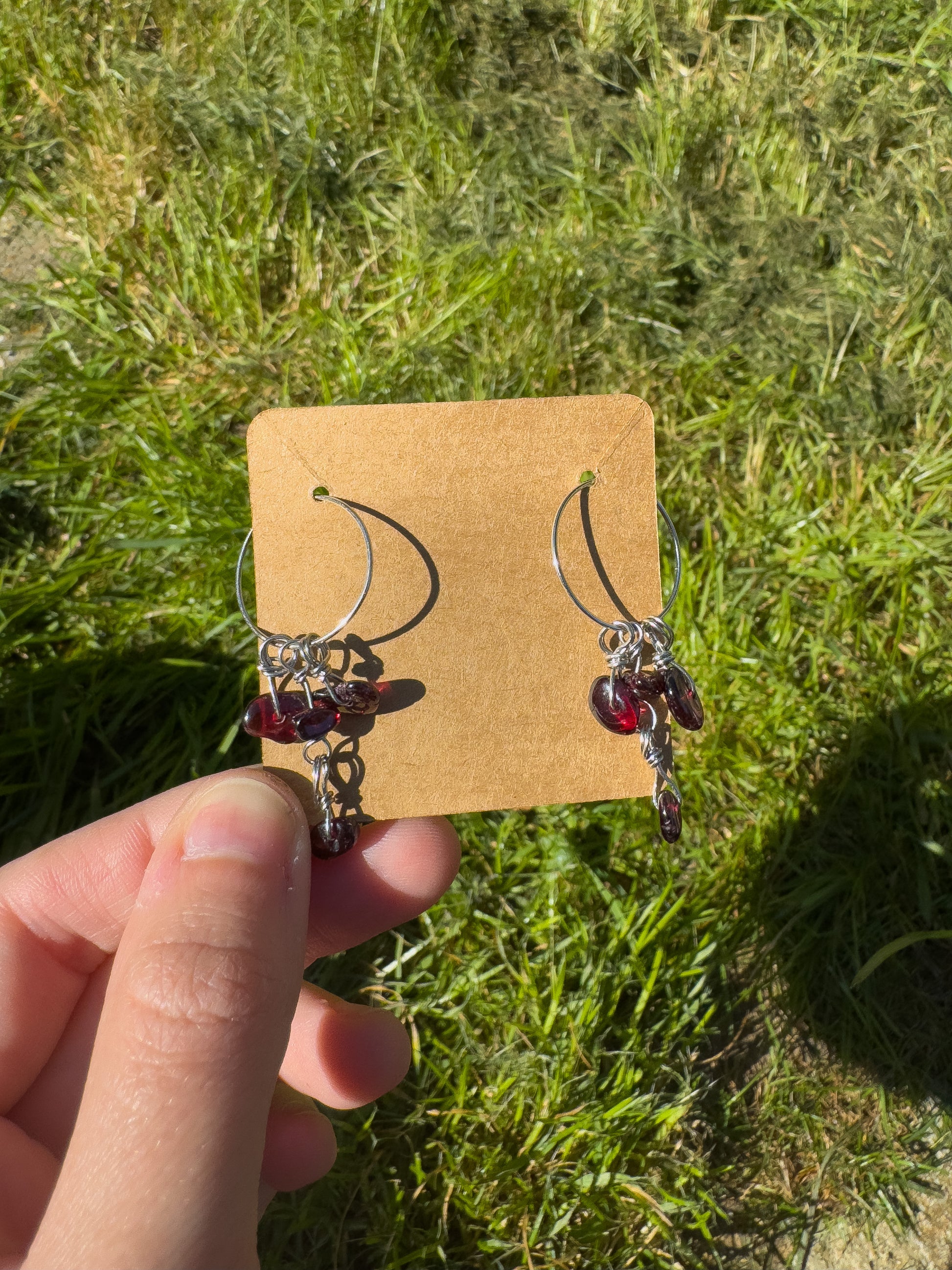 Handmade hoop earrings featuring natural garnet chips on stainless steel hoops.