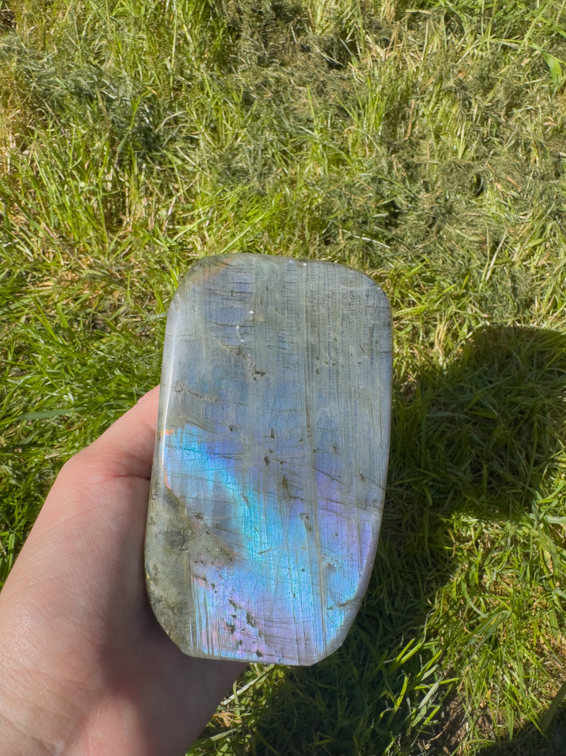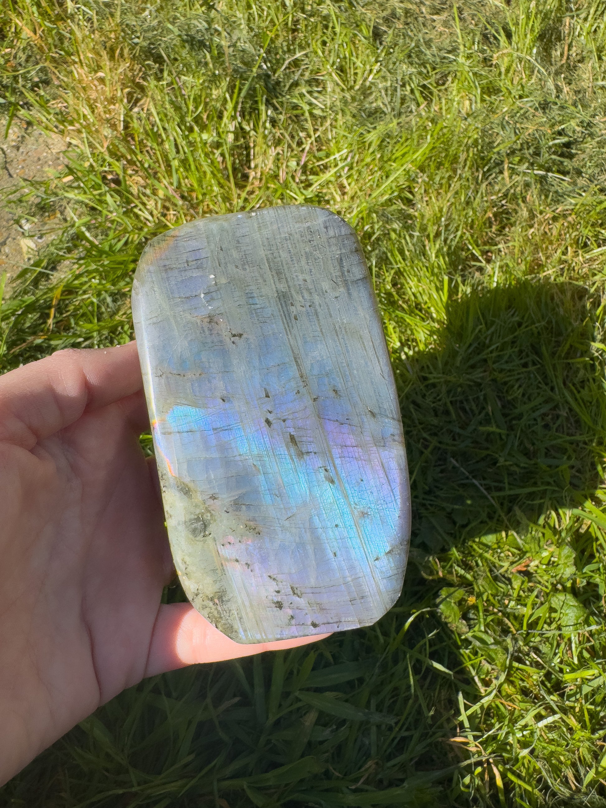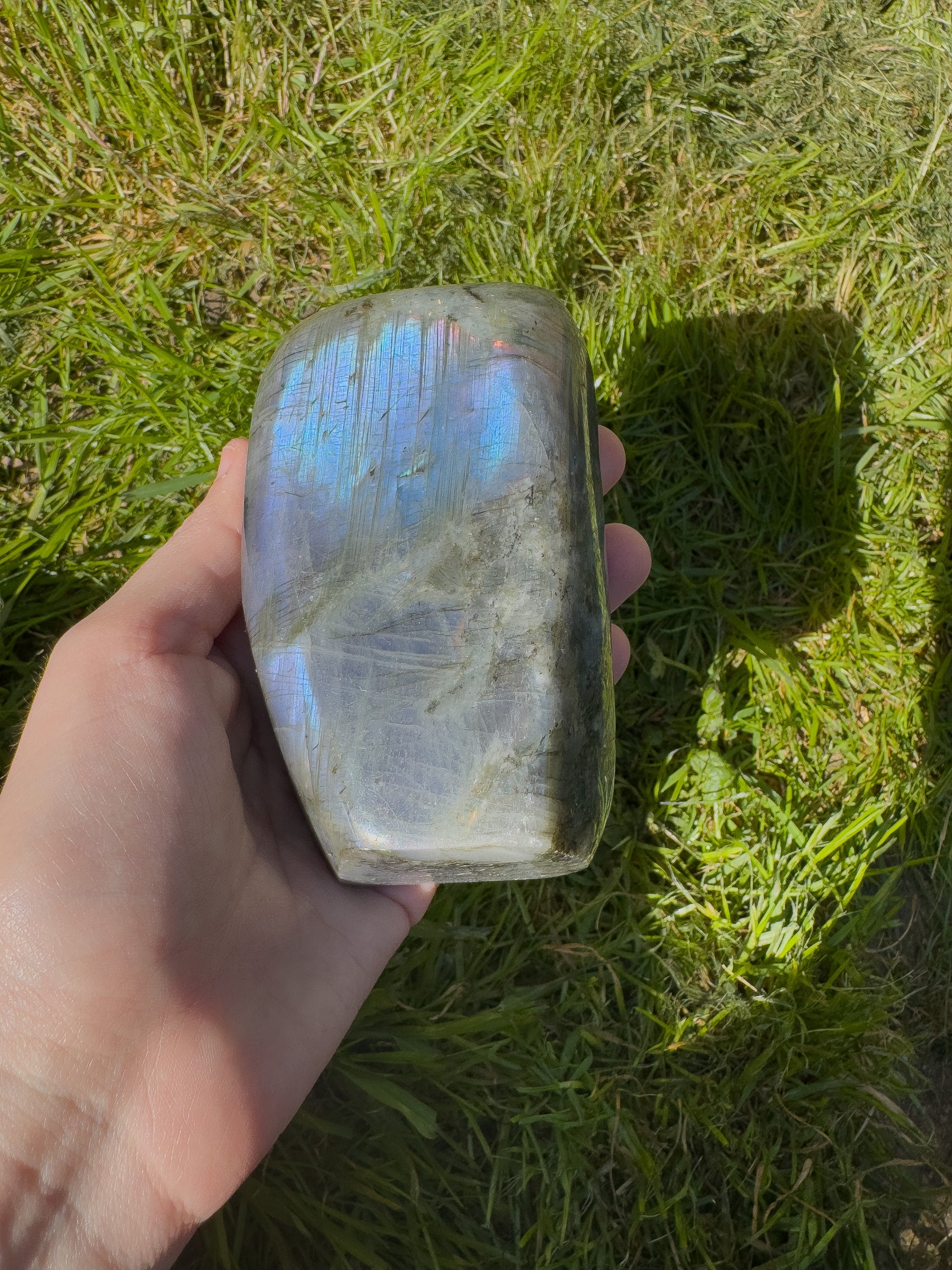 This stunning labradorite freeform features beautiful blue flashes that catch the light from different angles, making it a true eye-catcher for any collection.
