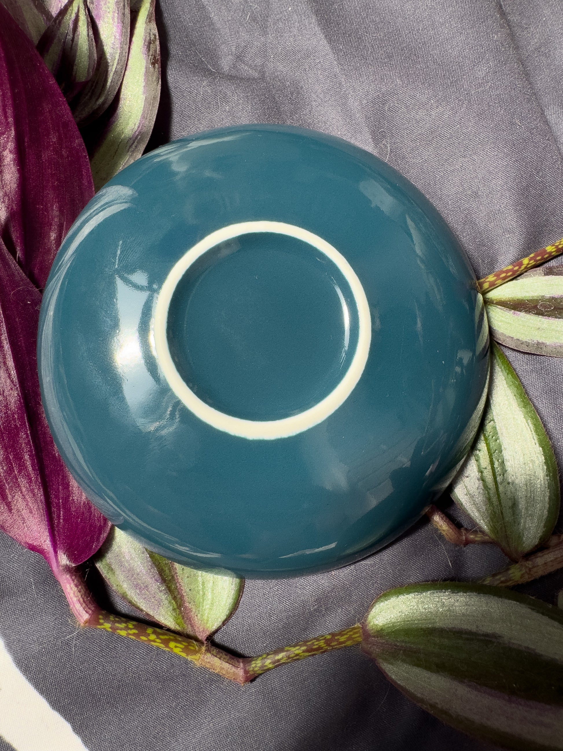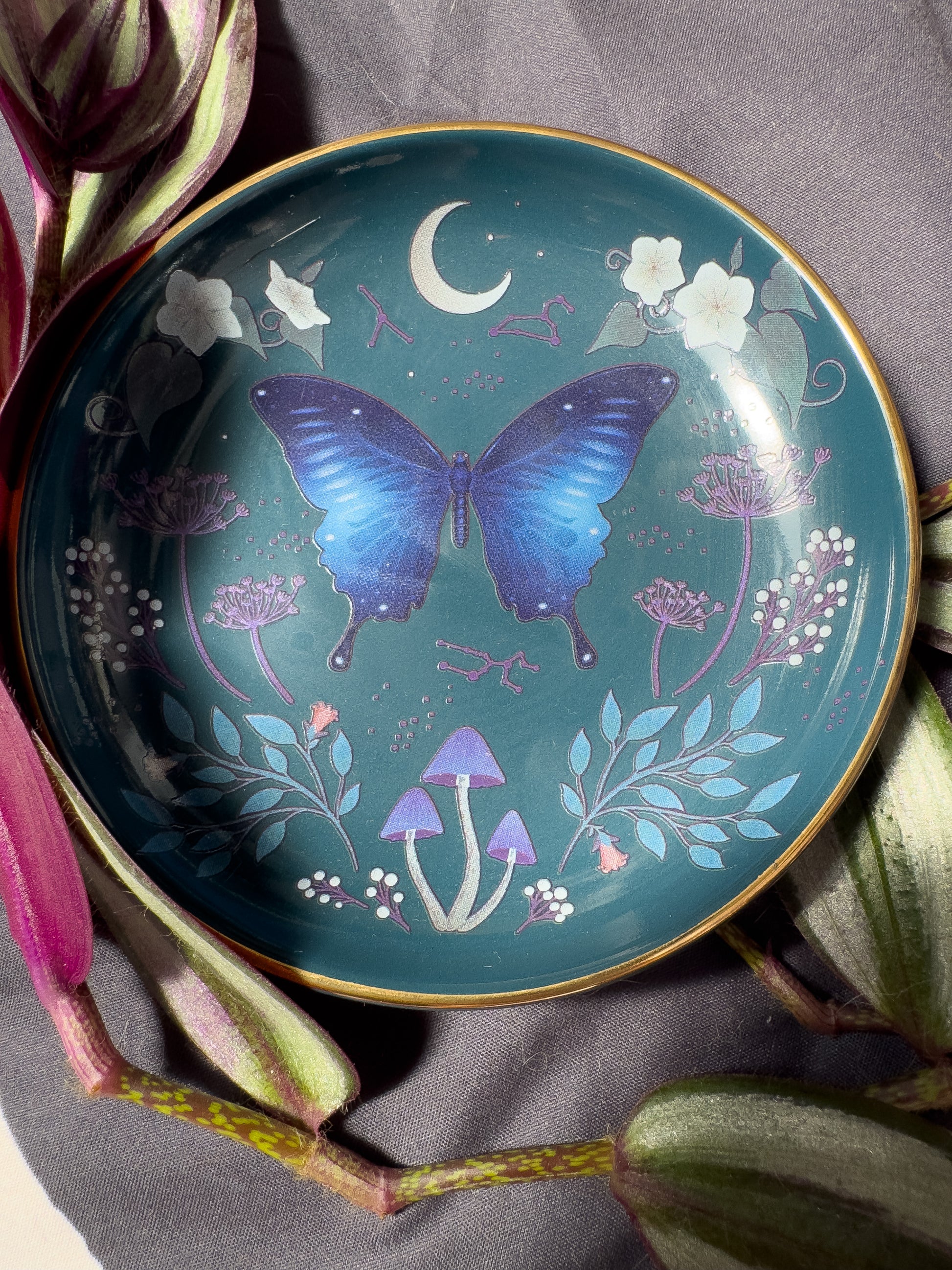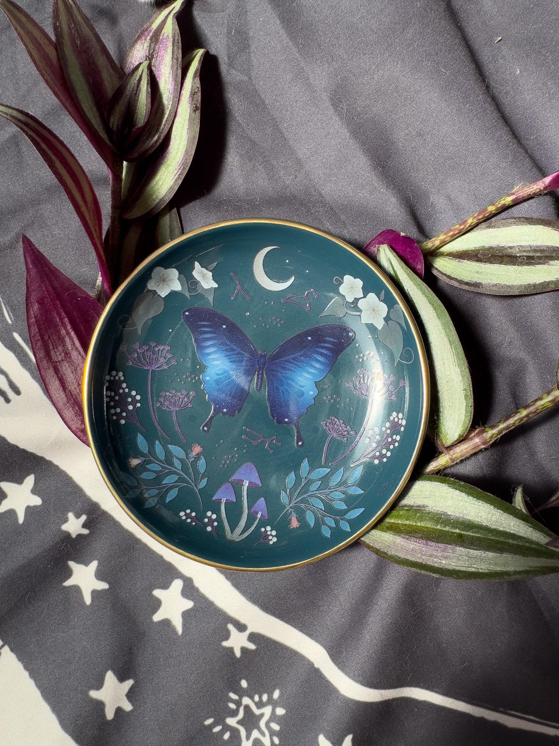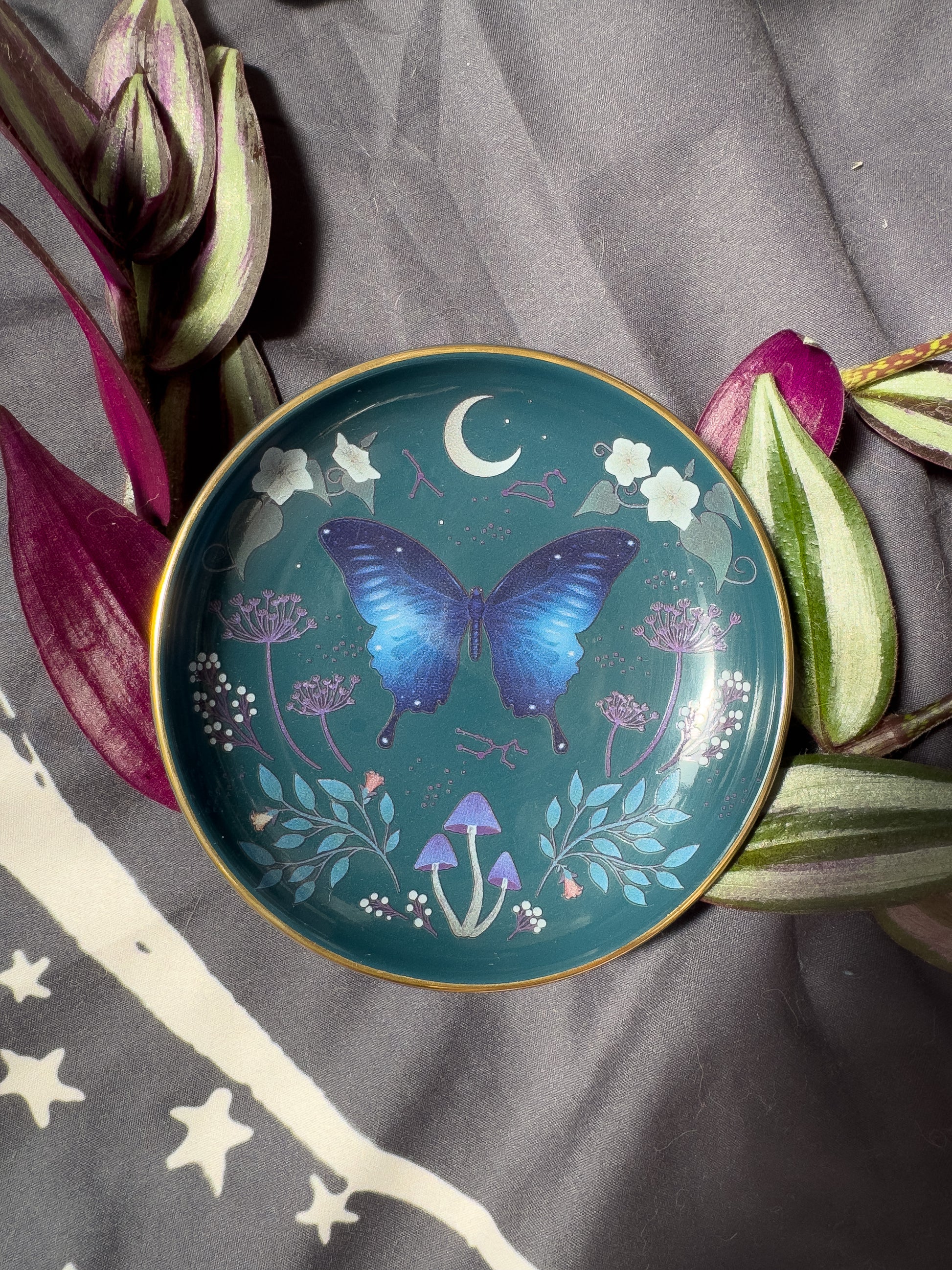 This midnight moth blue/green ceramic dish features a beautiful blue moth surrounded by forest details - mushrooms, leaves, and a glowing moon.