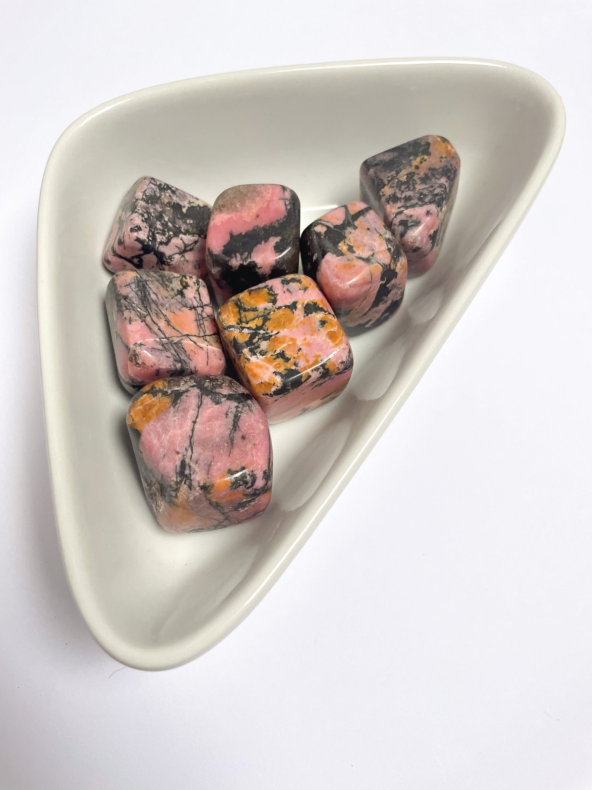 Lovely rhodonite tumblestones from Indonesia with rich pink and black tones.
