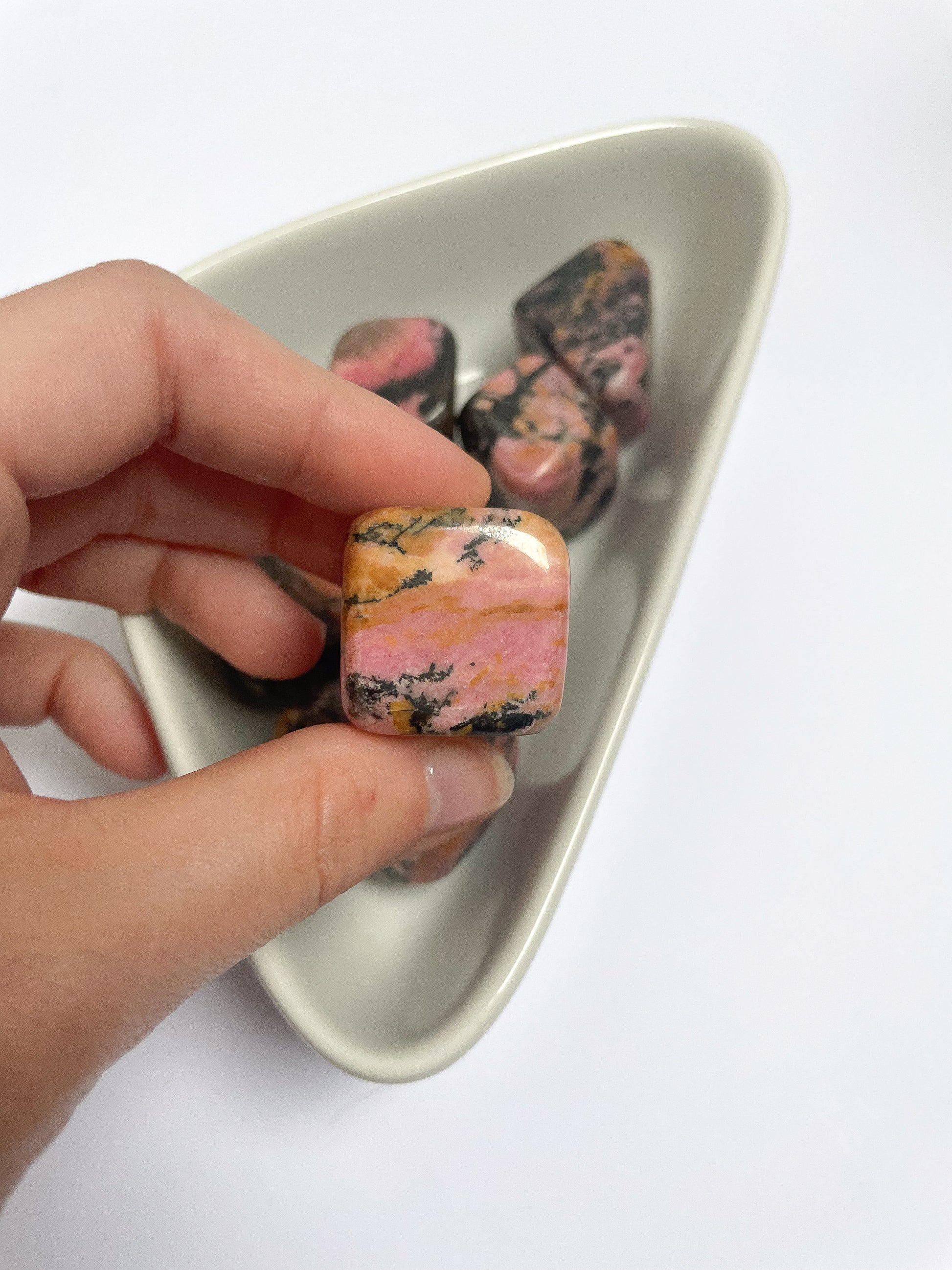 🌸Rhodonite is known as a stone of compassion, helping with emotional balance, forgiveness, and connecting to the heart chakra.