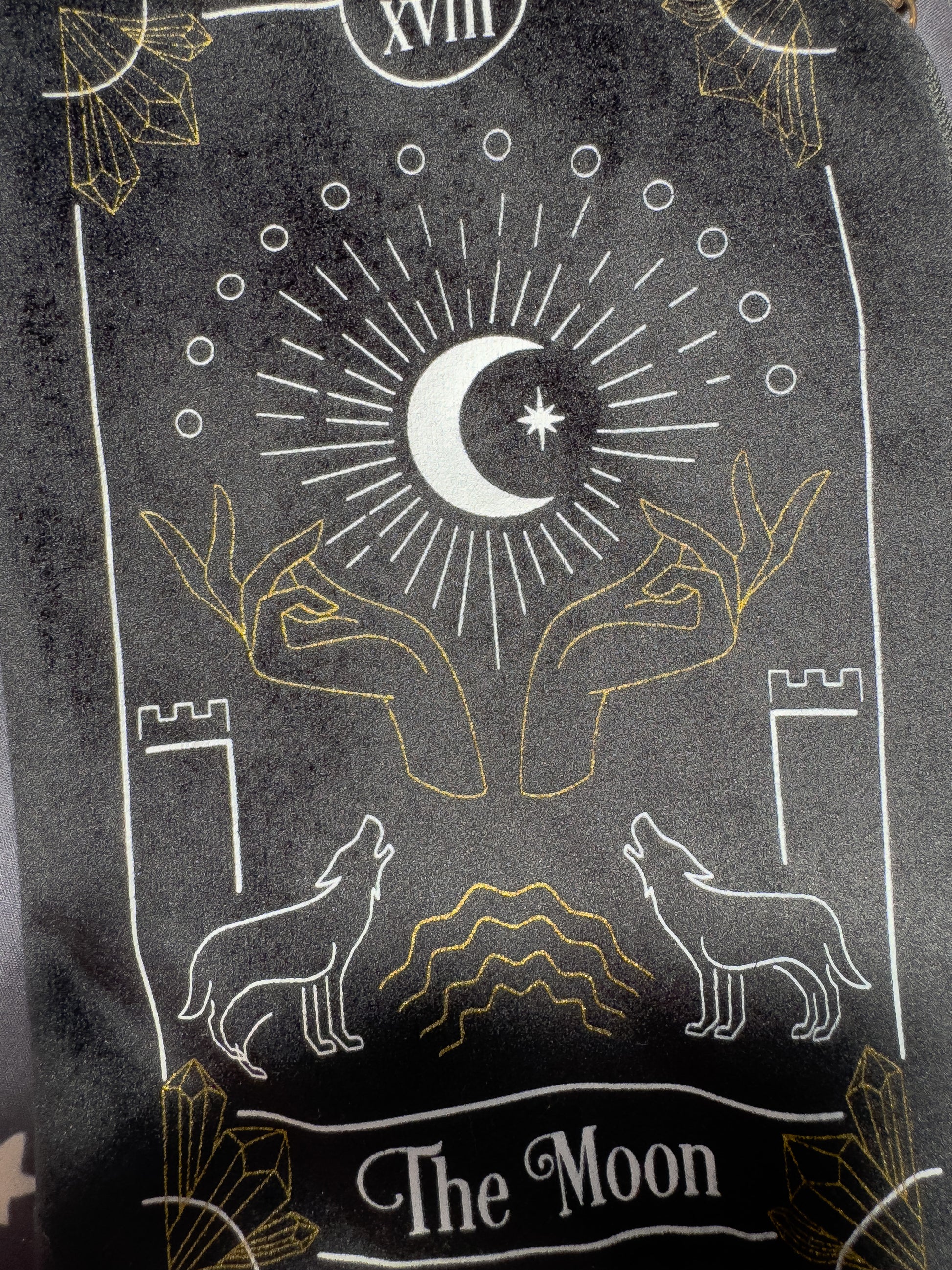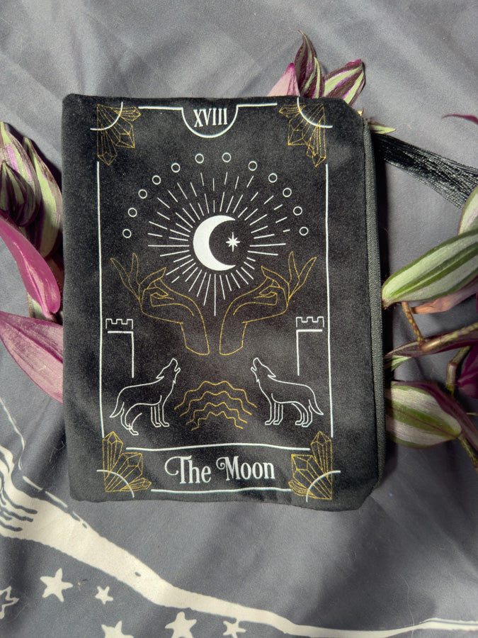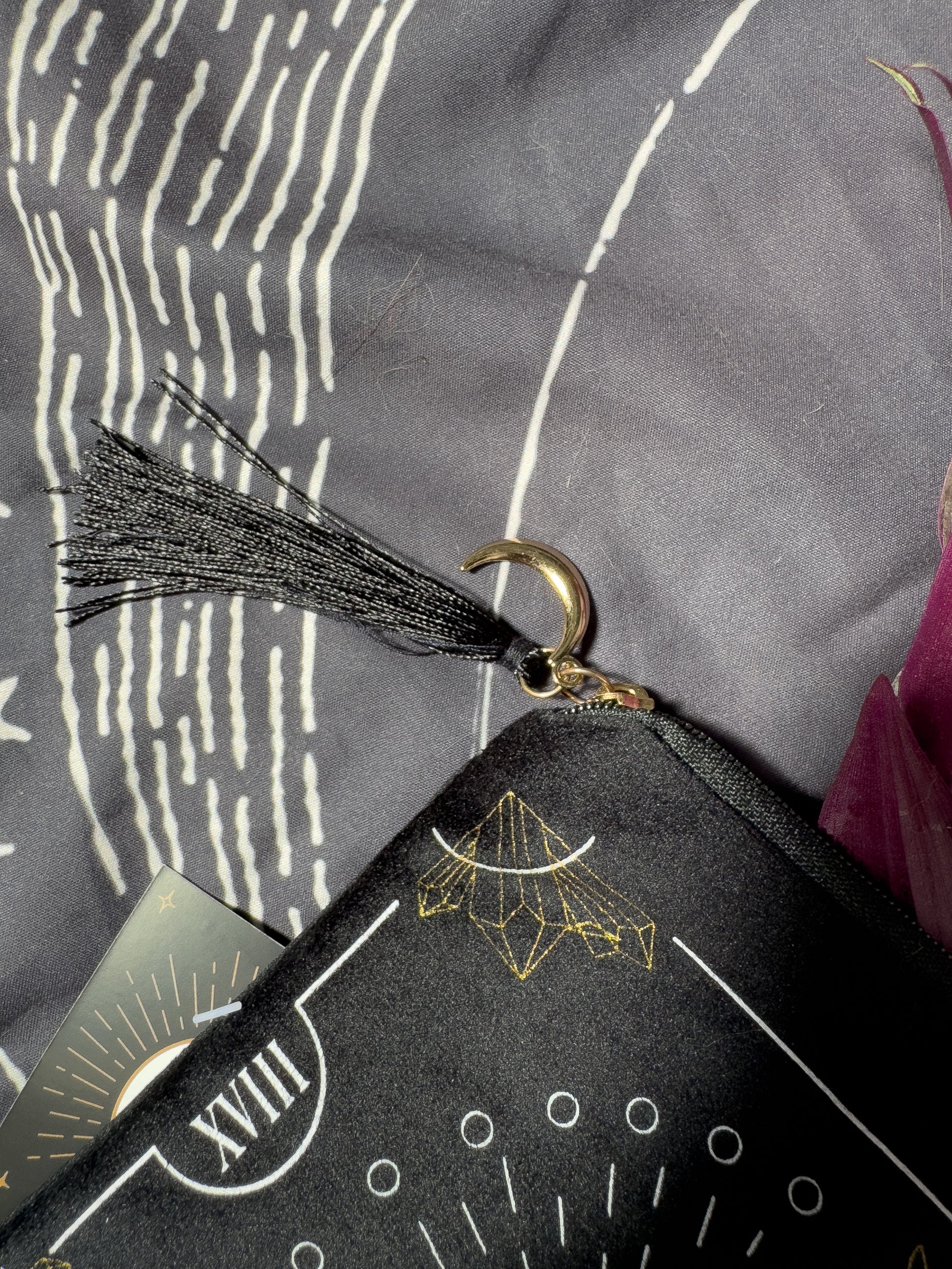 Features a gold moon charm on the zip and a celestial tarot-inspired design.