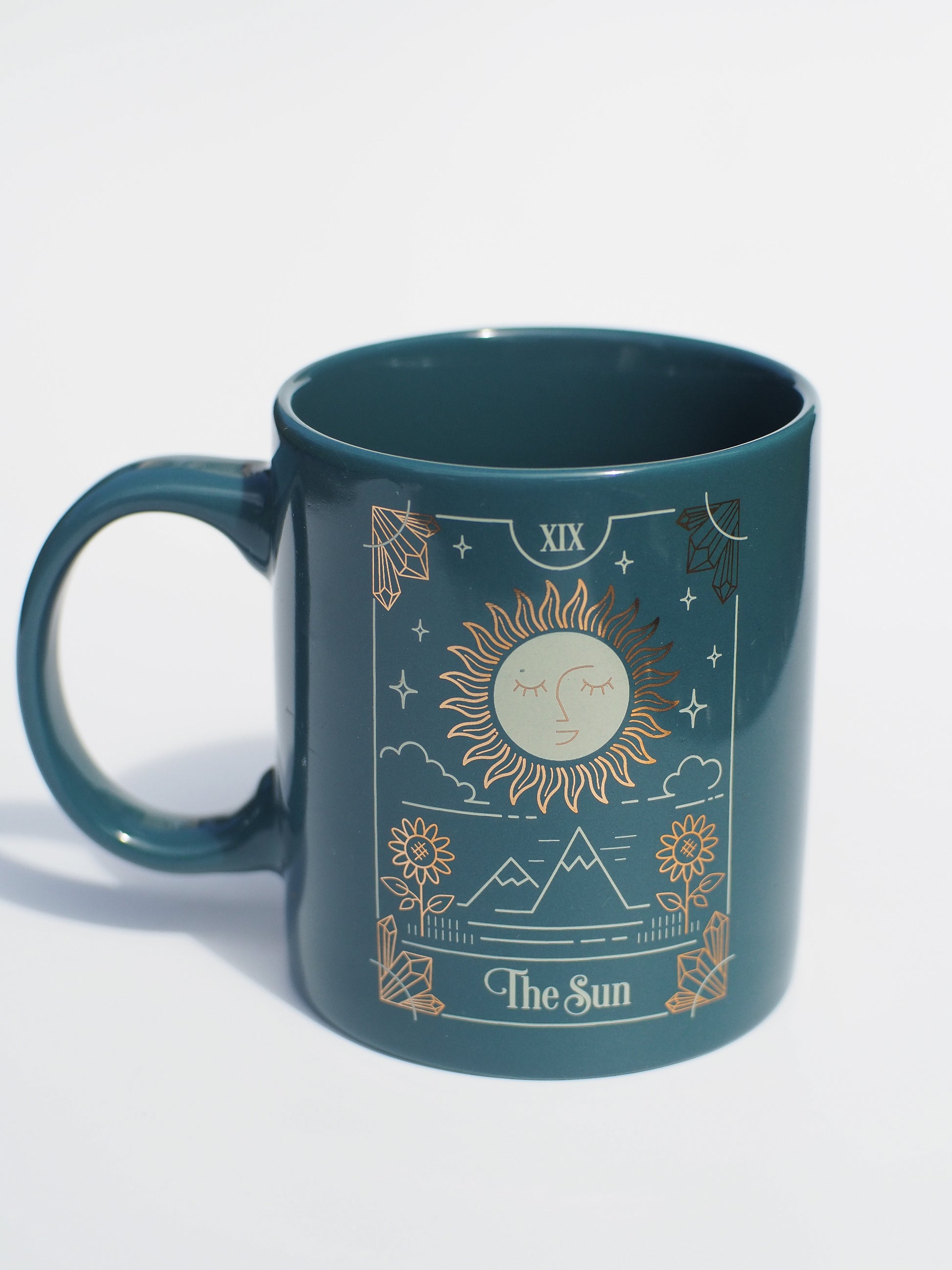 This traditional tarot design mug features The Sun illustration in white and gold foil, bringing brightness and positivity to your day. With a 350ml capacity, this mug is dishwasher and microwave safe, making it both stylish and practical.